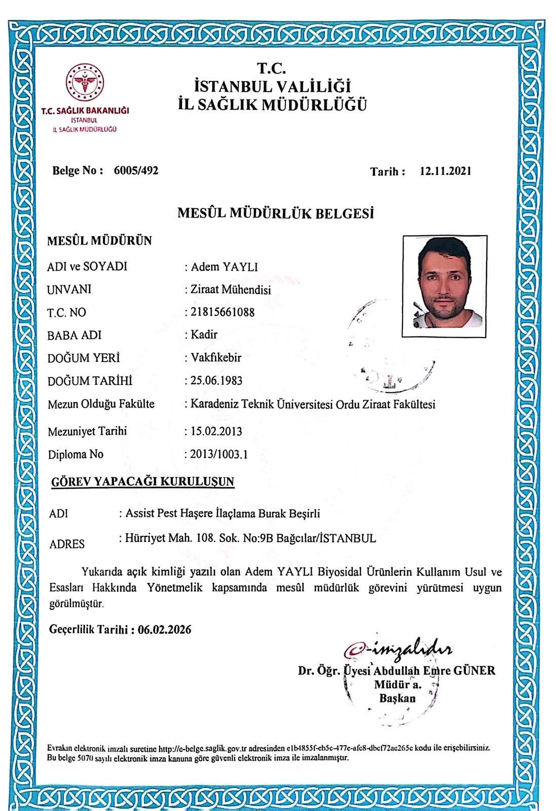 Şirketimiz, SAĞLIK BAKANLIĞI ONAYLI olarak ilaçlama hizmetlerini yerine getirmektedir.